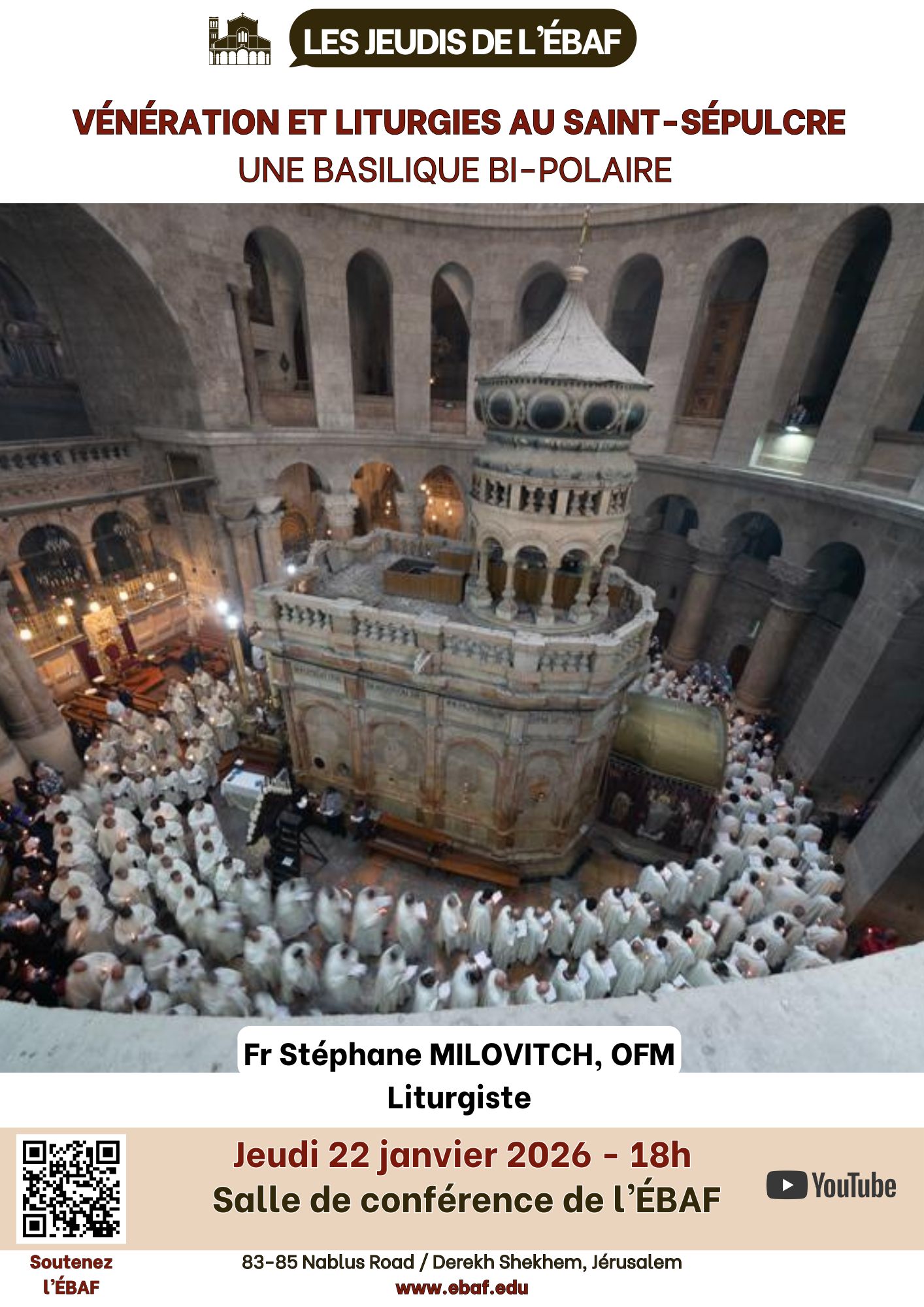 Jeudi 22 janvier 2026, à 18h00, l’École biblique et archéologique française de Jérusalem aura la joie d’accueillir le frère Stéphane Milovitch, OFM, liturgiste et ancien « président de la communauté du Saint-Sépulcre », pour la conférence :