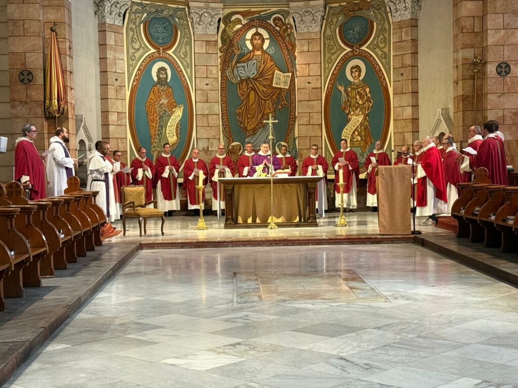 Le jeudi à midi, une messe solennelle a été célébrée dans la basilique Saint-Étienne. Dans son homélie, le Maître de l’Ordre a commenté l’Évangile du jour (Mt 7, 7-12), soulignant la confiance filiale exprimée dans l’invitation du Christ à demander, chercher et frapper. Il a rapproché cette attitude spirituelle de l’intuition développée par Francis Thompson dans le poème The Hound of Heaven (1893), évoquant la persévérance de la grâce divine qui rejoint l’homme jusque dans sa fuite.