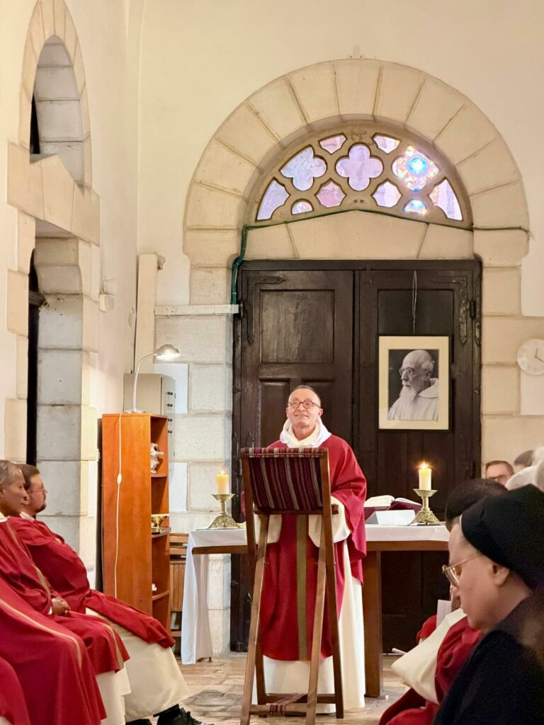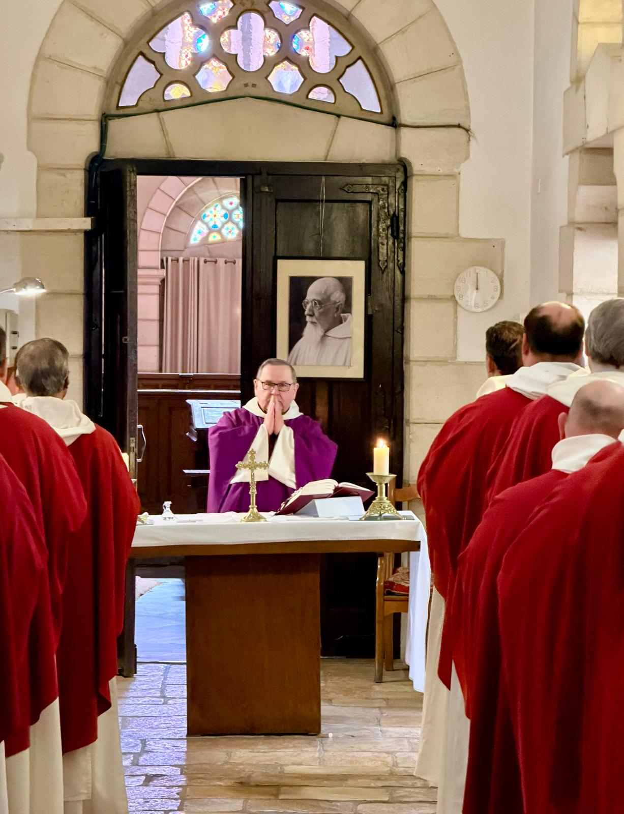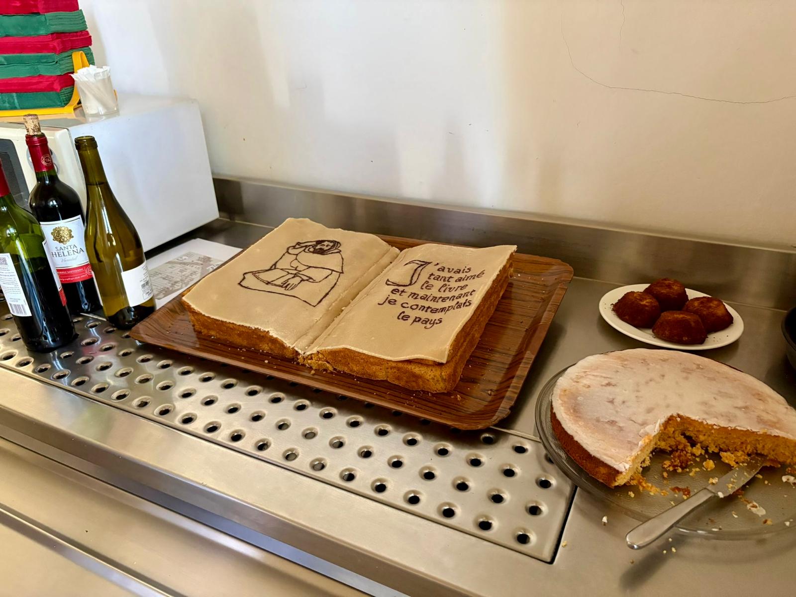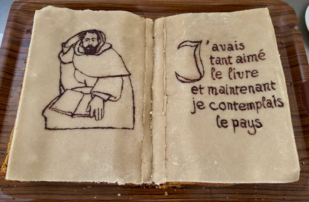 À l’issue de la célébration, les frères ainsi que la communauté de l’ÉBAF se sont retrouvés pour un déjeuner fraternel. À cette occasion, tous ont pu savourer un gâteau spécial, en forme de livre, préparé par le frère Pierre de Marolles.