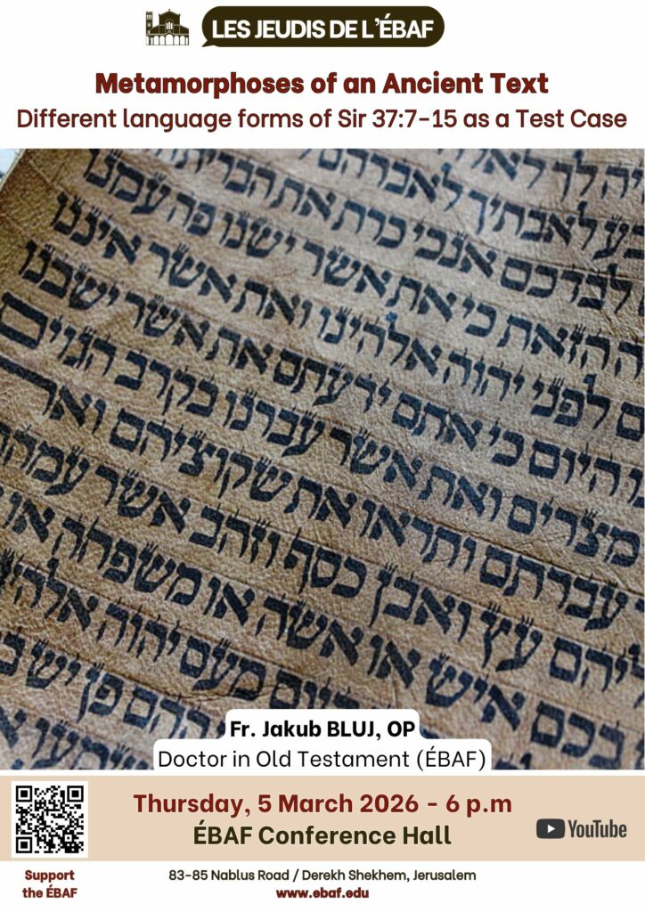 Le jeudi 5 mars 2026 à 18h00, l’École biblique et archéologique française de Jérusalem accueillera une nouvelle conférence dans le cadre de la série « Les Jeudis de l’ÉBAF ». Le fr. Jakub Bluj, op, docteur en Ancien Testament de l’École biblique, présentera une intervention en anglais intitulée Metamorphoses of an Ancient Text: Different language forms of Sir 37:7–15 as a Test Case.